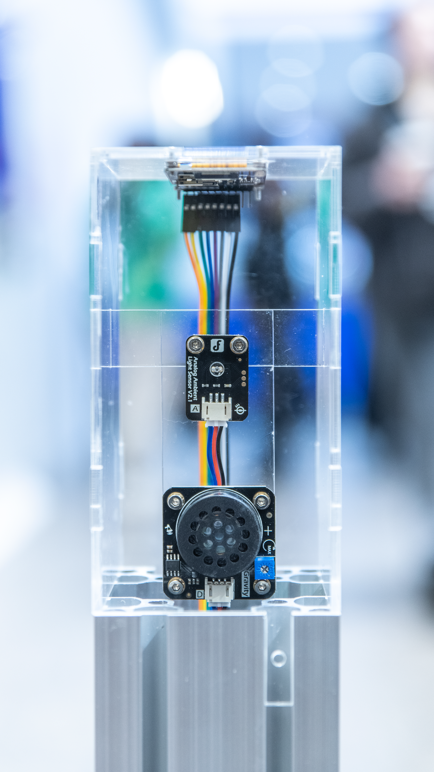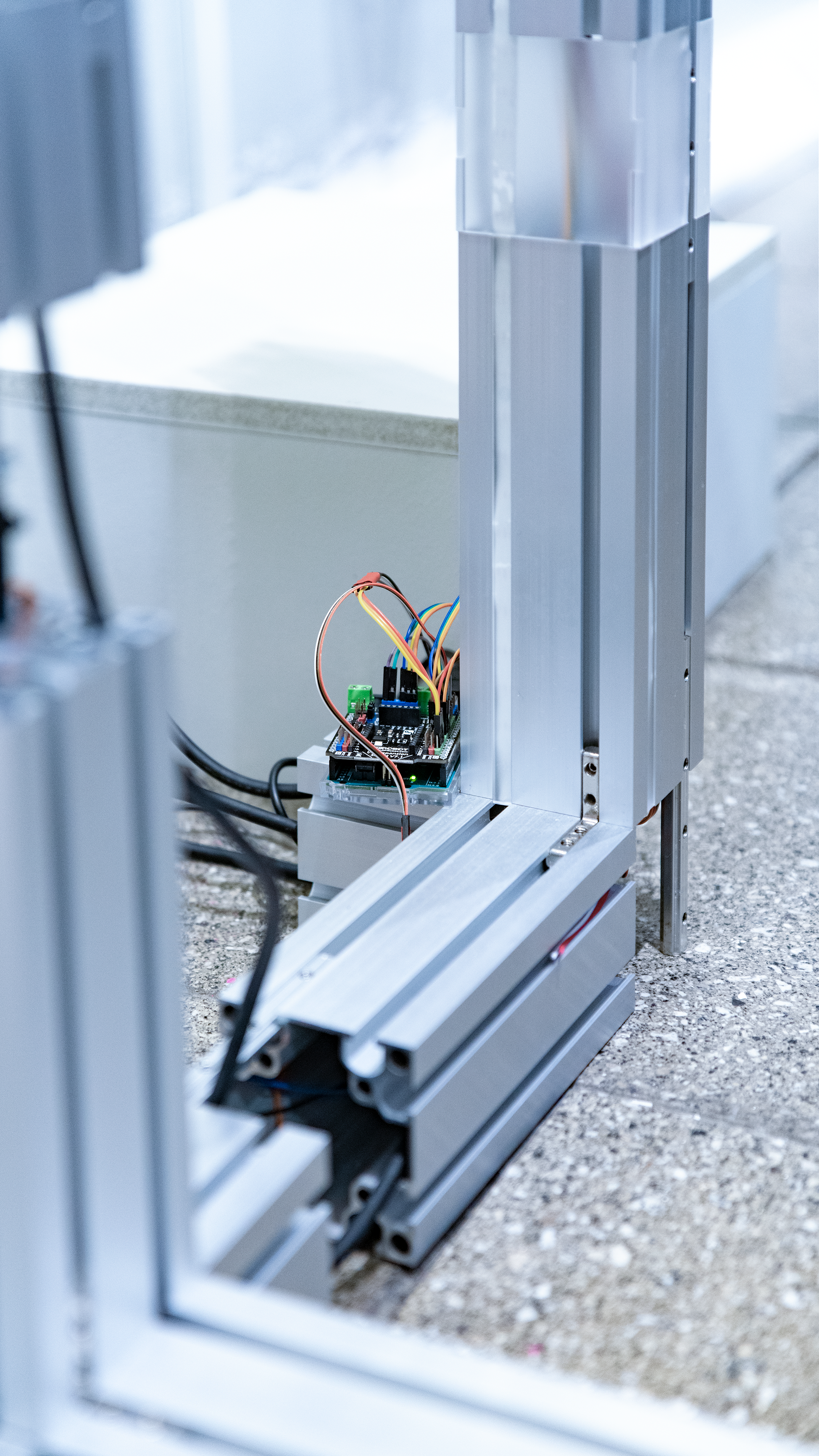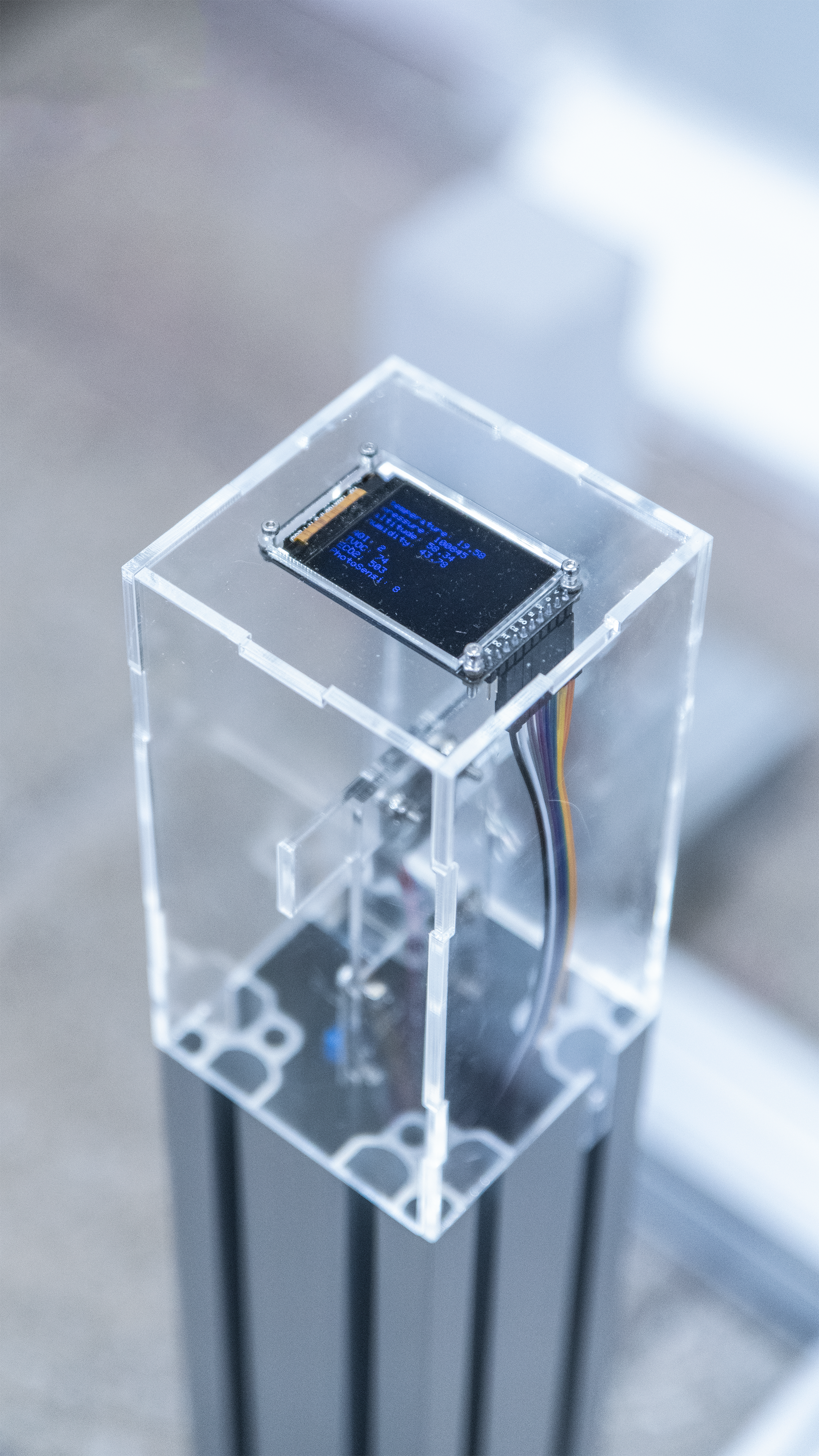 The installation metaphorically illustrates the stratification of power within data ecosystems: central sensors amassing comprehensive data symbolise dominant power nodes, secondary sensors signify auxiliary data support akin to the local governance, and tertiary feedback sensors represent the limited public interaction with their data. This embodiment critiques the active yet unequal data acquisition and control in smart cities, serving as a microcosmic representation of power dynamics in the digital urban landscape.